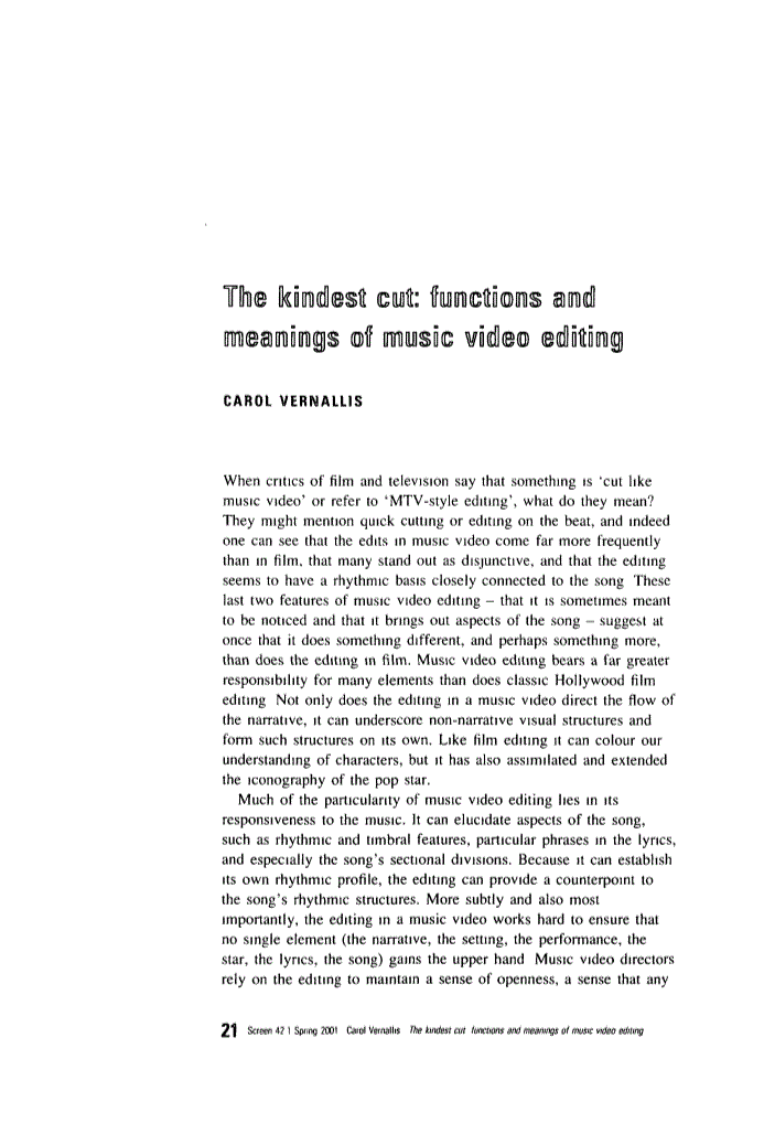 Vernallis also mentions editing as a fundamental focus of her study; she states particularly that music videos often break the fundamental rules of continuity, taking the audience away from typical film conventions found in narrative film or TV.